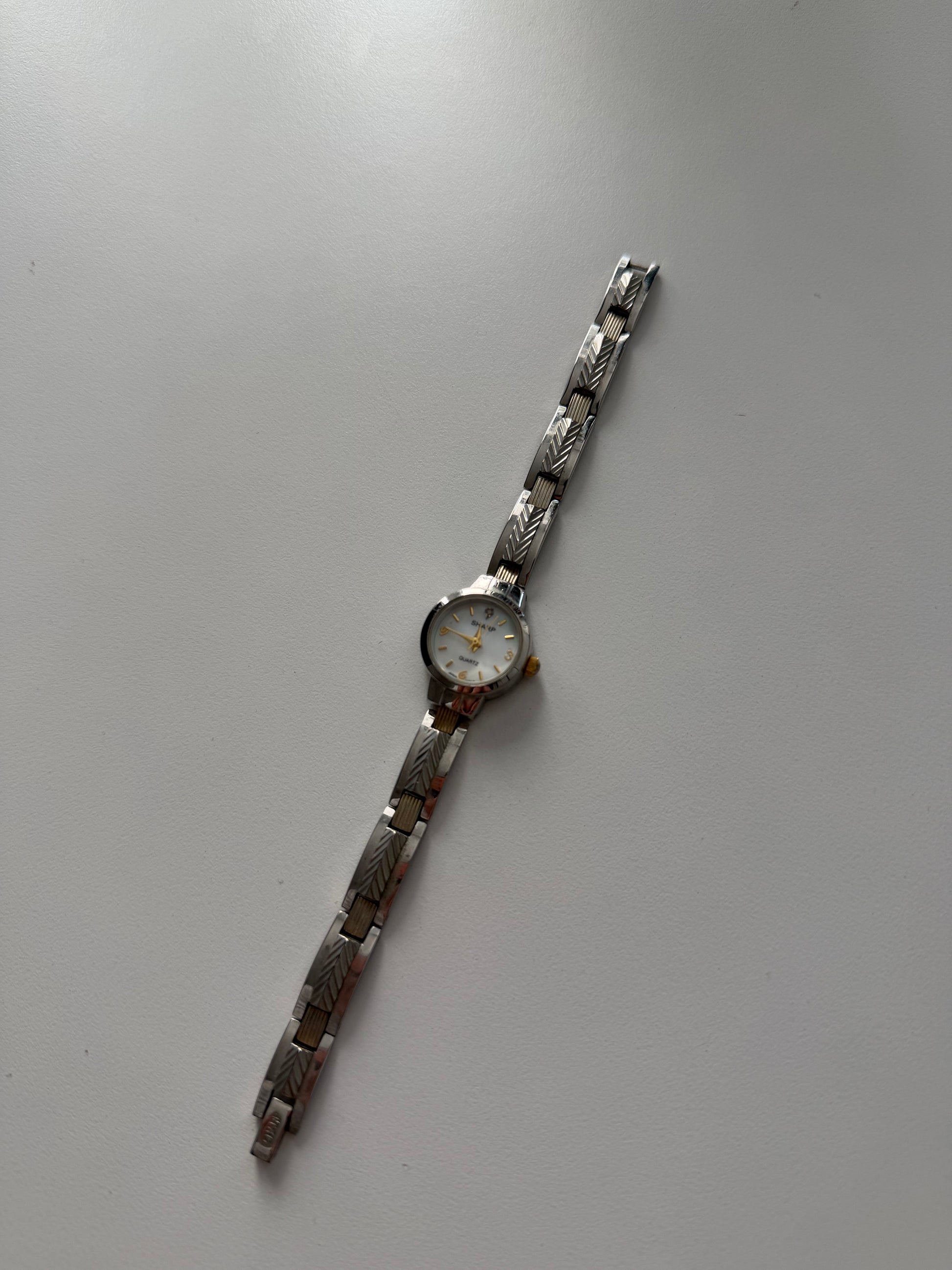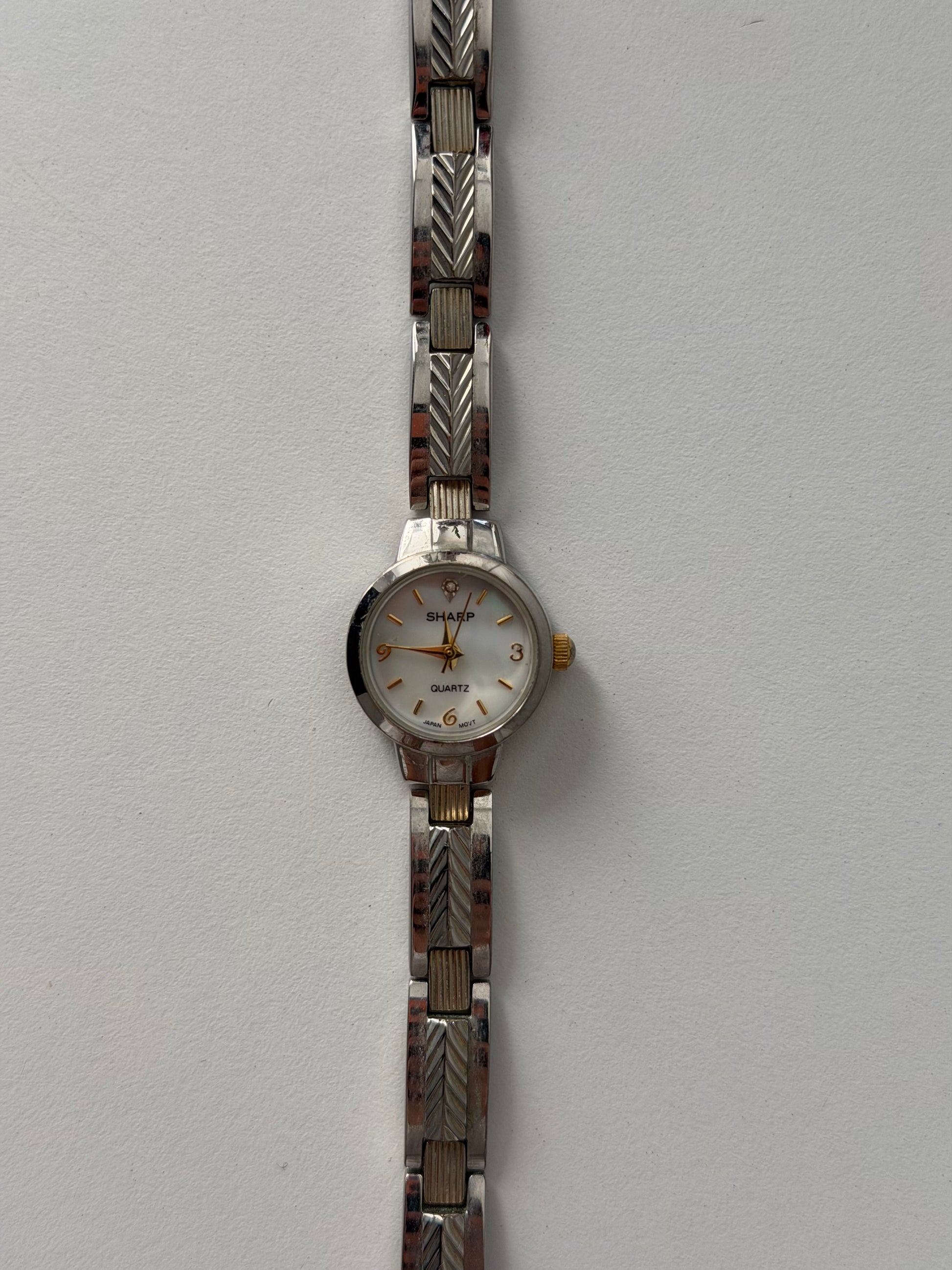 Sharp Dainty silver toned watch with a mother of pearl dial, and small diamond - stunning band - super cute and in amazing condition! This piece is a classic and looks beautiful on the wrist and matches any stack!