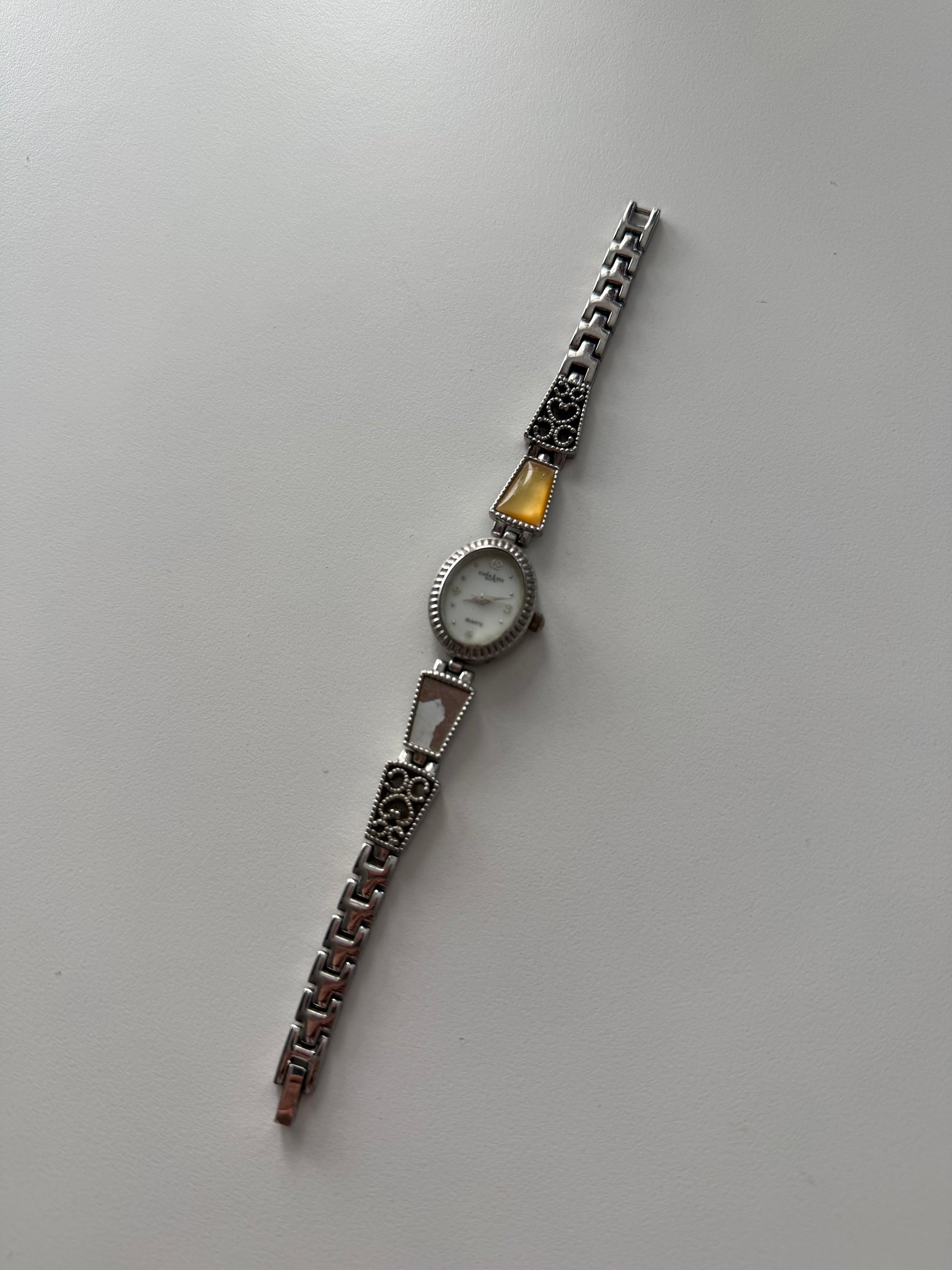 GORGEOUS yellow gemstone watch with beautiful band and mother of peral dial. Such a stunning piece and beautiful on the wrist! Missing one yellow stone.